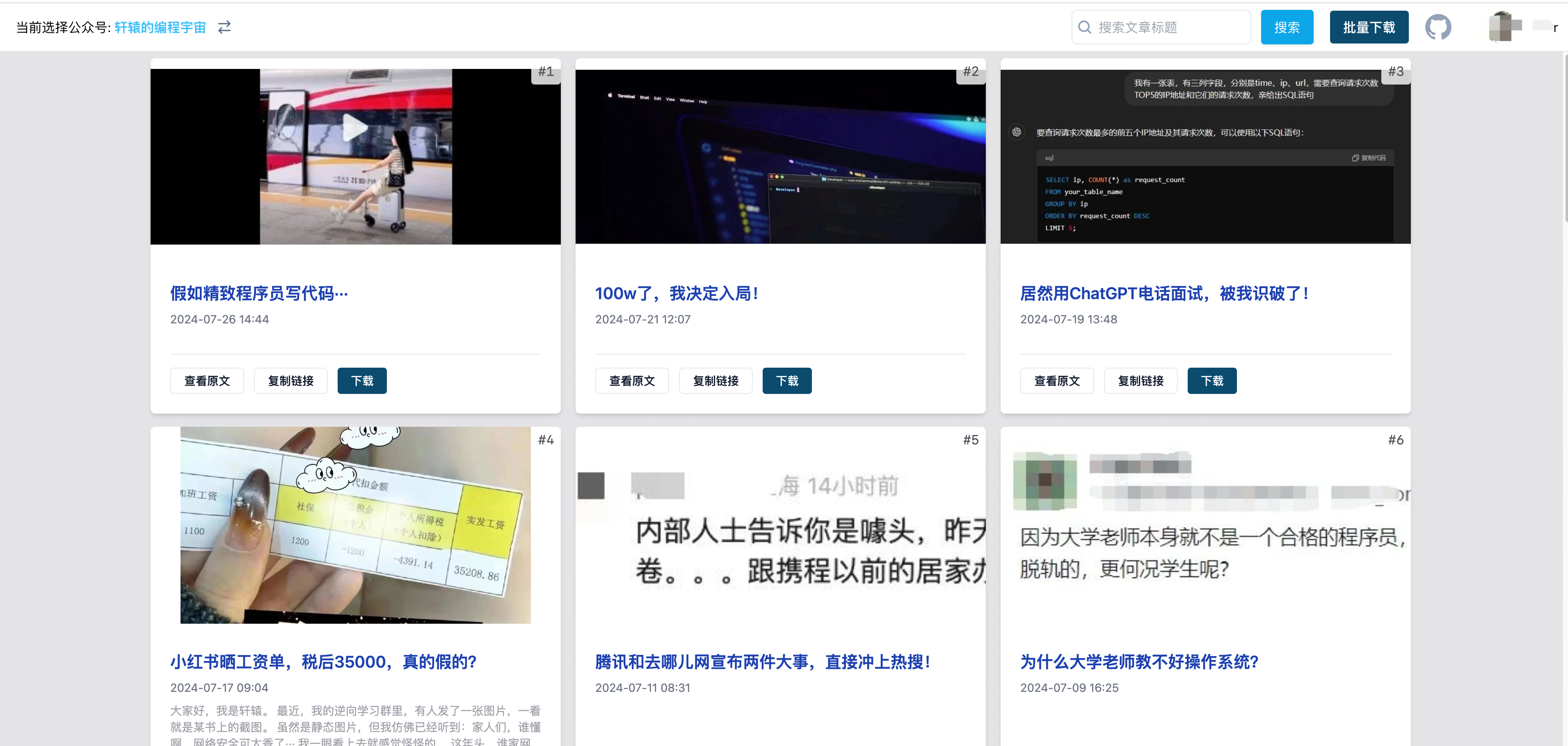 很多人比较关注的订阅功能,我打算另起一个项目去做,这个项目就专心做历史文章的下载了,新项目暂时不打算开源,根据后续具体的结果会出会员版(如果我觉得效果不好,可能就不会出了,到时希望朋友们多多支持)。